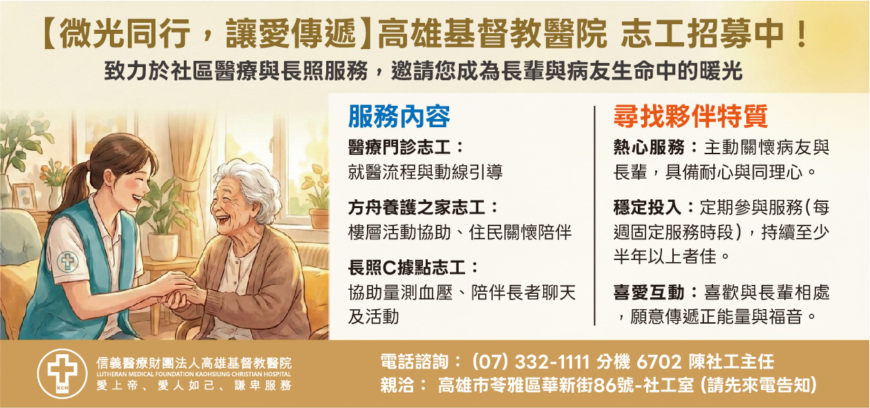 誠摯邀請您加入 高雄基督教醫院志工行列,成為長輩與病友生命中的一束暖光。 透過陪伴與關懷,讓愛在社區中持續流動,為每一段生命旅程增添溫暖與力量。