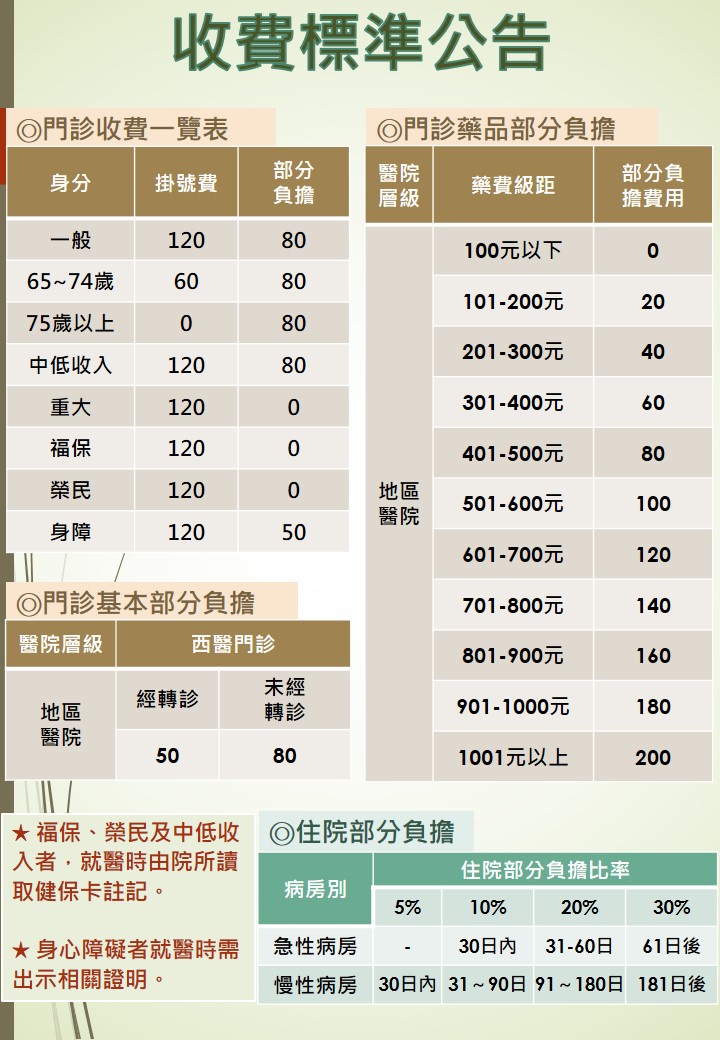 各項醫療服務收費明細,請依您的就醫身分與診療項目參閱下列標準。本表適用於地區醫院層級。